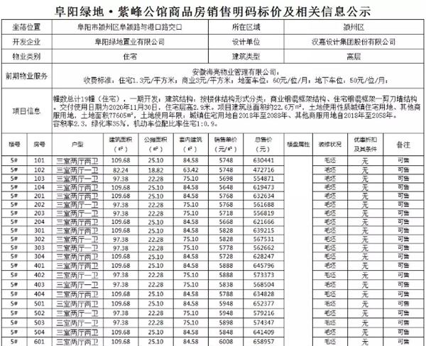 由下图可知,阜阳绿地·紫峰公馆此次备案房价最低单价5478元/㎡,最高备案单价仅6538元/㎡。