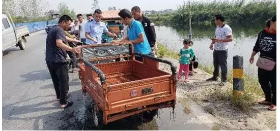 今天(24日)中午13时许,一辆电瓶三轮车连人带车开进了水塘中。