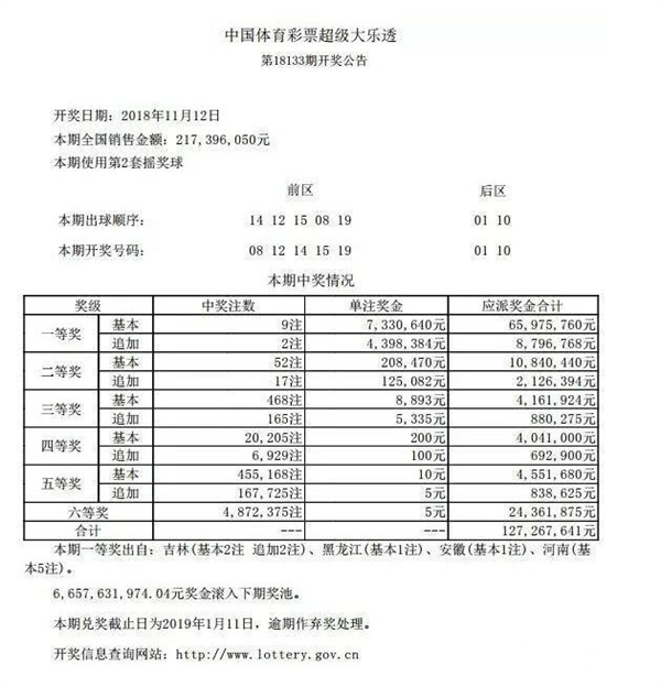 11月12日大乐透18133期开奖号码:08、12、14、15、19+01、10。一等奖基本9注每注733万,出自吉林(2注)河南(5注)黑龙江(1注)安徽(1注),追加2注每注439万,出自吉林(2注)。