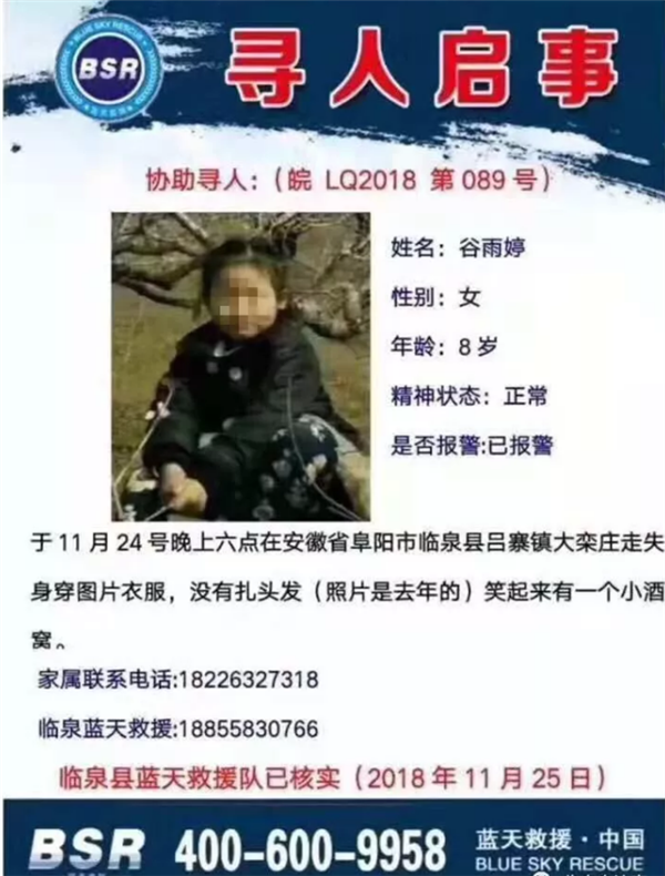 紧急寻人!十万火急!谷雨婷,女,8岁!于昨晚走失!家人万分着急!谷雨婷,女,8岁,于11月24号五点半至六点之间,在安徽省阜阳市临泉县吕寨镇大栾庄走失,走失时身穿衣服与图片相同,只是没有扎头发笑起来有